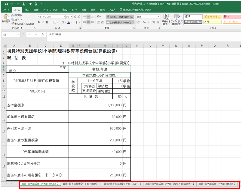 特別支援学校は、種別毎にシートが分かれて出力されます。