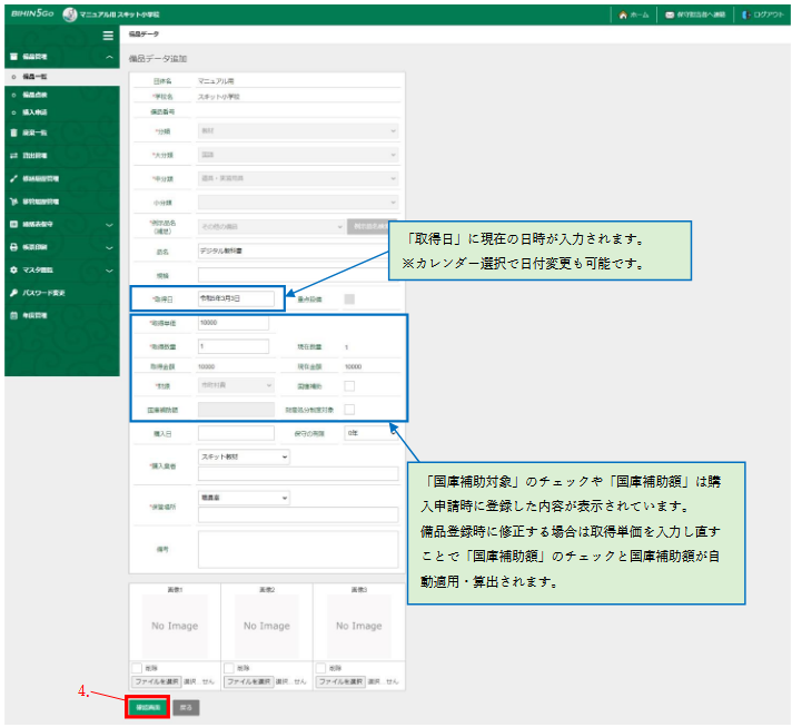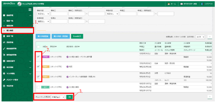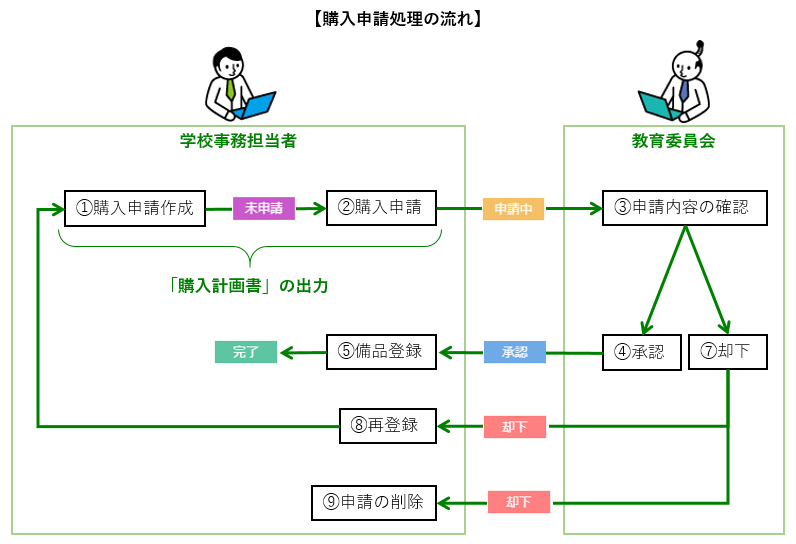 「購入申請」とは、購入計画段階の備品を申請し、教育委員会の承認を得て備品登録するための機能です。