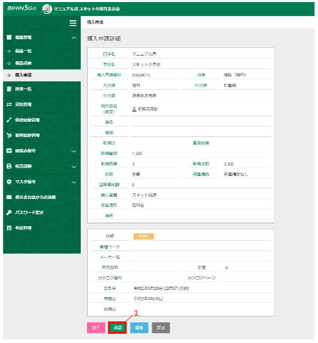 - 「購入申請詳細」画面の内容を確認し、[承認]を押下します。