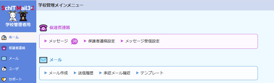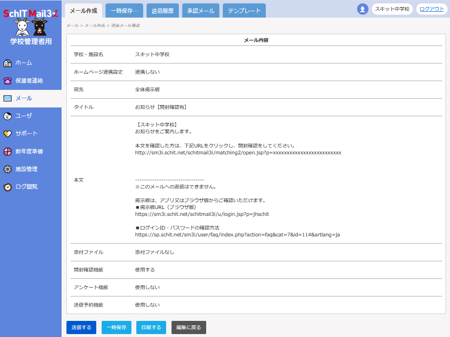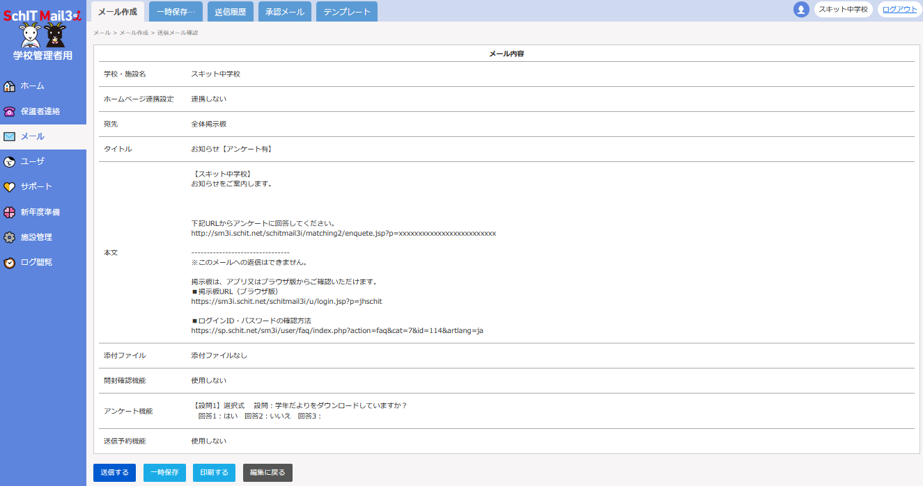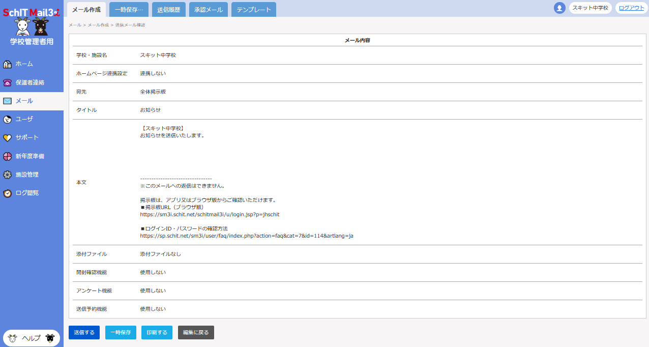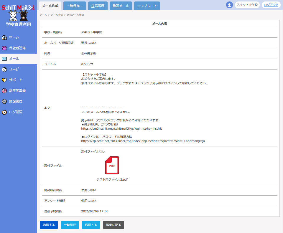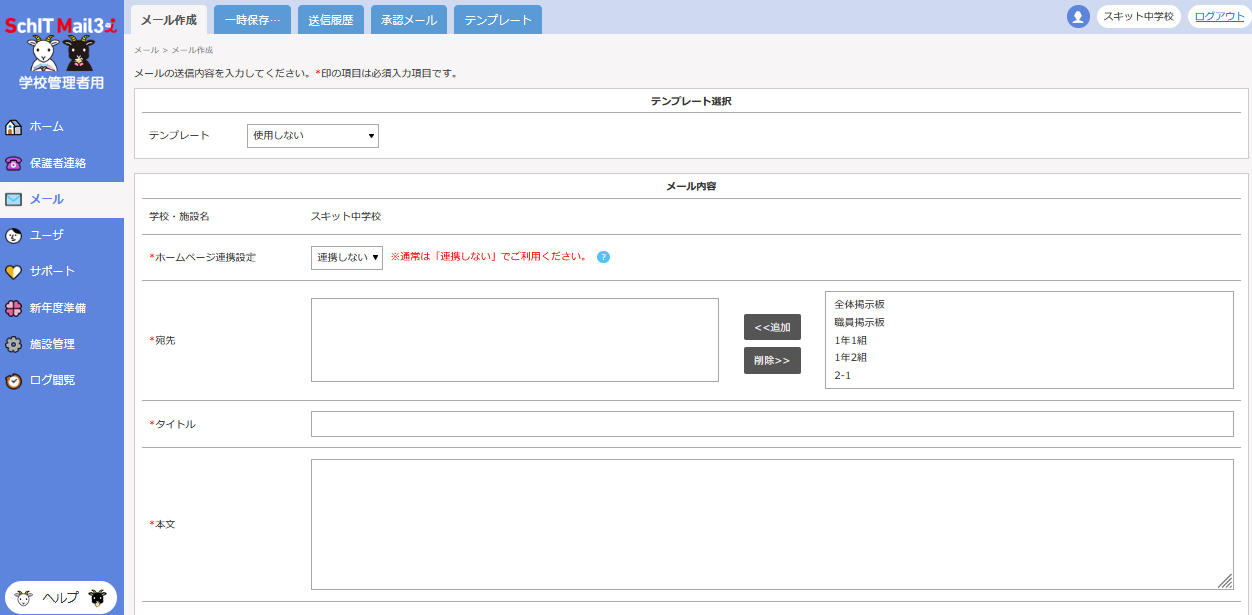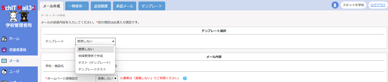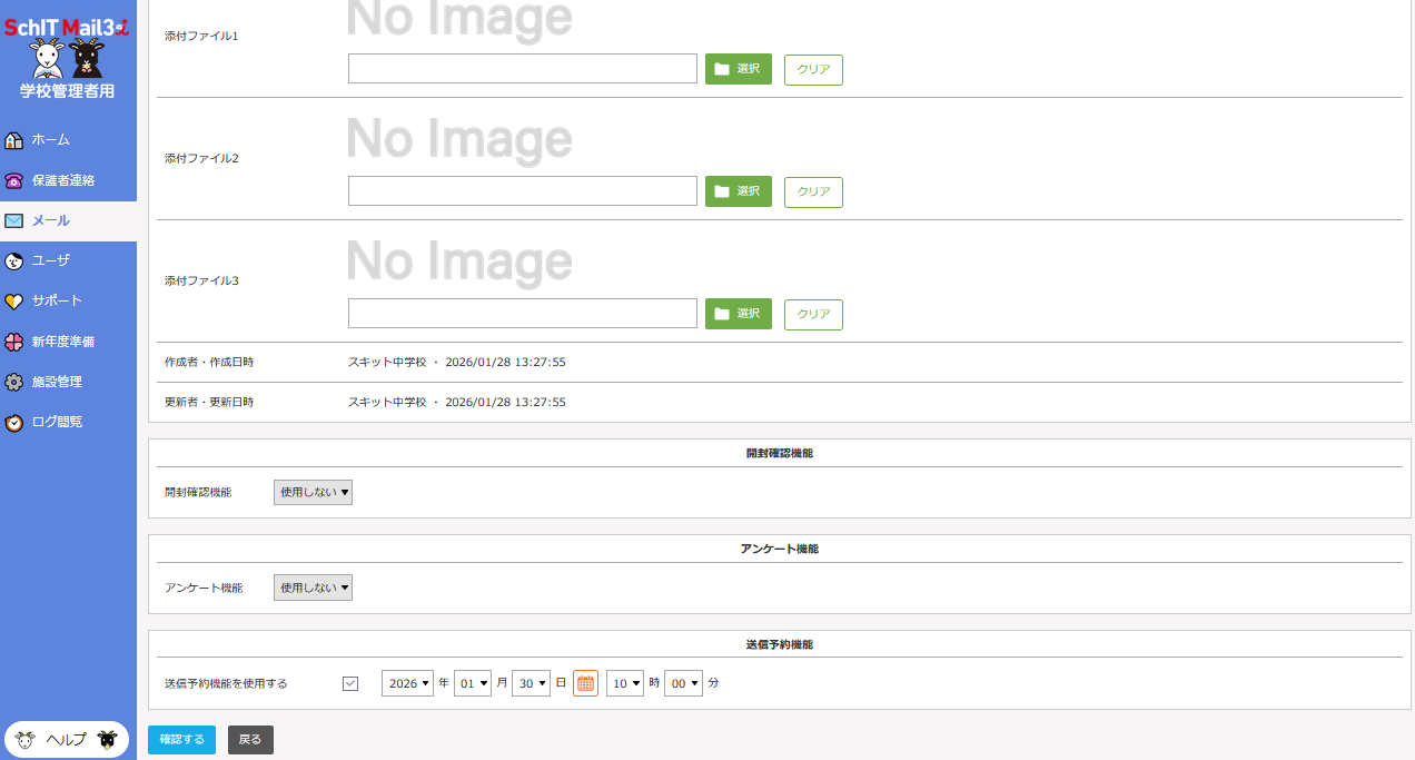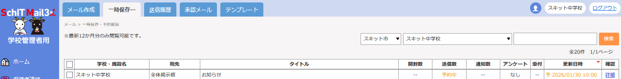 予約機能を使用する際は、パソコンから学校管理者用サイトにアクセスして、メールを作成してください。