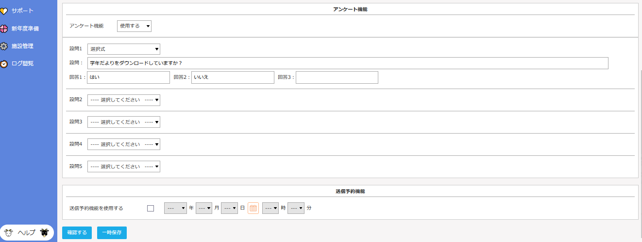 - アンケートの設問や回答を入力して、[確認する]をクリックします。