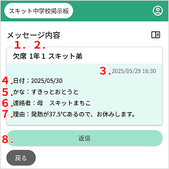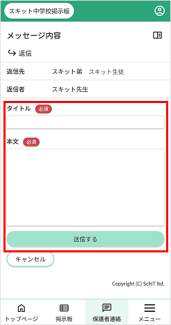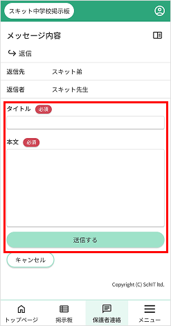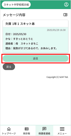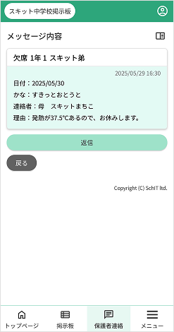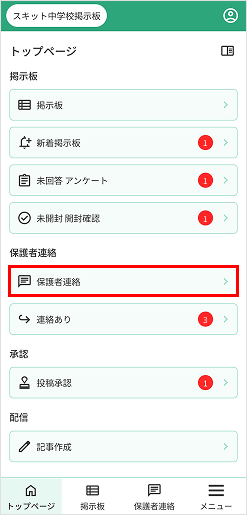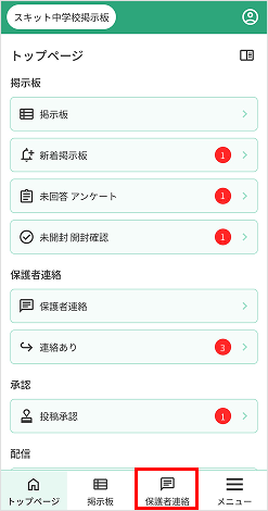 教職員用の保護者連絡のページです。保護者からの連絡を確認し、返信することができます。