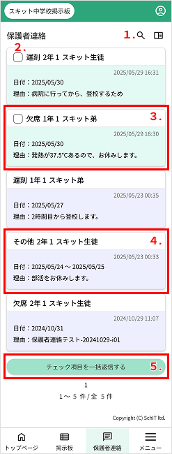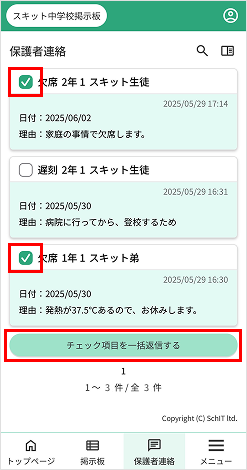 - 一括返信ボタン…チェックを入れた保護者連絡を一括返信できる