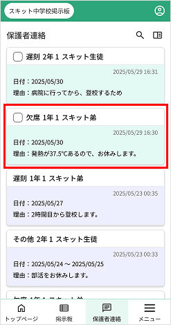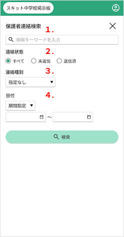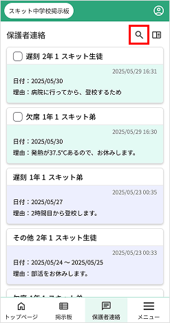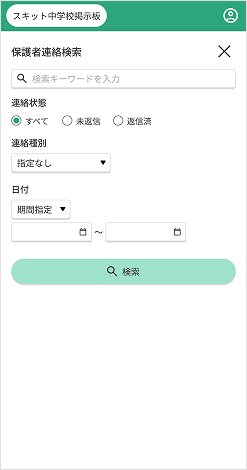 - 欠席、遅刻などの学校が入力した連絡種別から検索