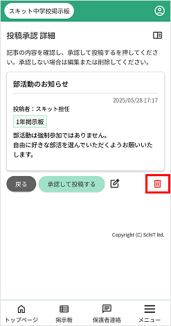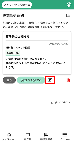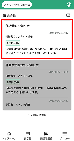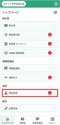 掲示板に書き込み権限のあるユーザーが作成した記事を、学校管理者が投稿承認することができます。