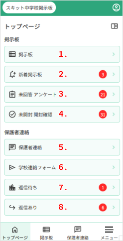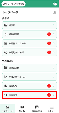 8. [返信あり]…学校へ連絡を送信後、学校から返信があり、未読の返信連絡の件数が表示