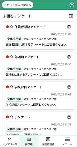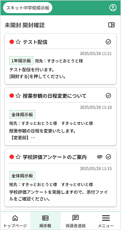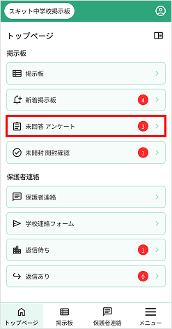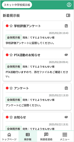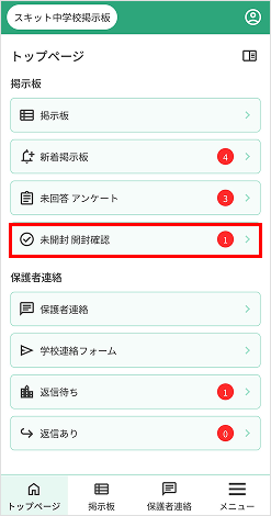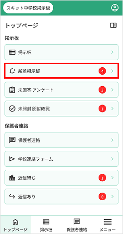 トップページには、新着記事、未回答のアンケート記事、未開封の開封確認の表示や保護者連絡の返信通知が表示されます。