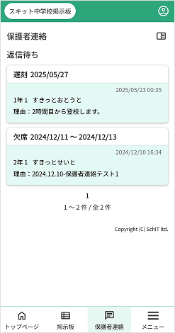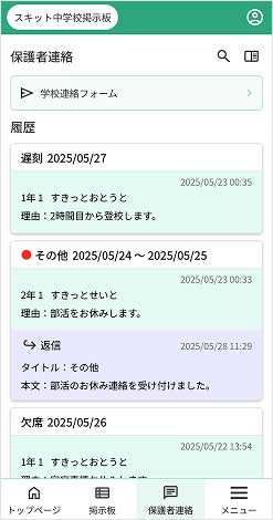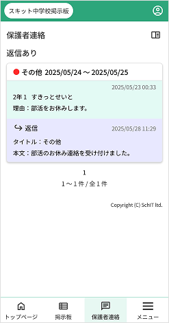 2. 連絡を送信後、学校から返信が届いた連絡を表示します。