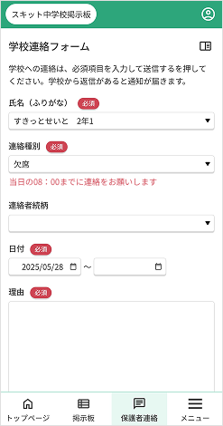 6. [学校連絡フォーム]…学校へ連絡する入力画面が表示