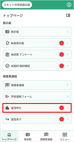 7. [返信待ち]…学校へ連絡を送信後、学校からの返信待ち連絡件数が表示